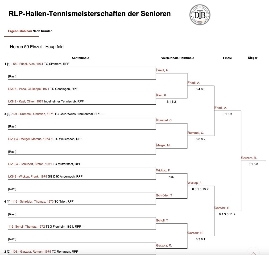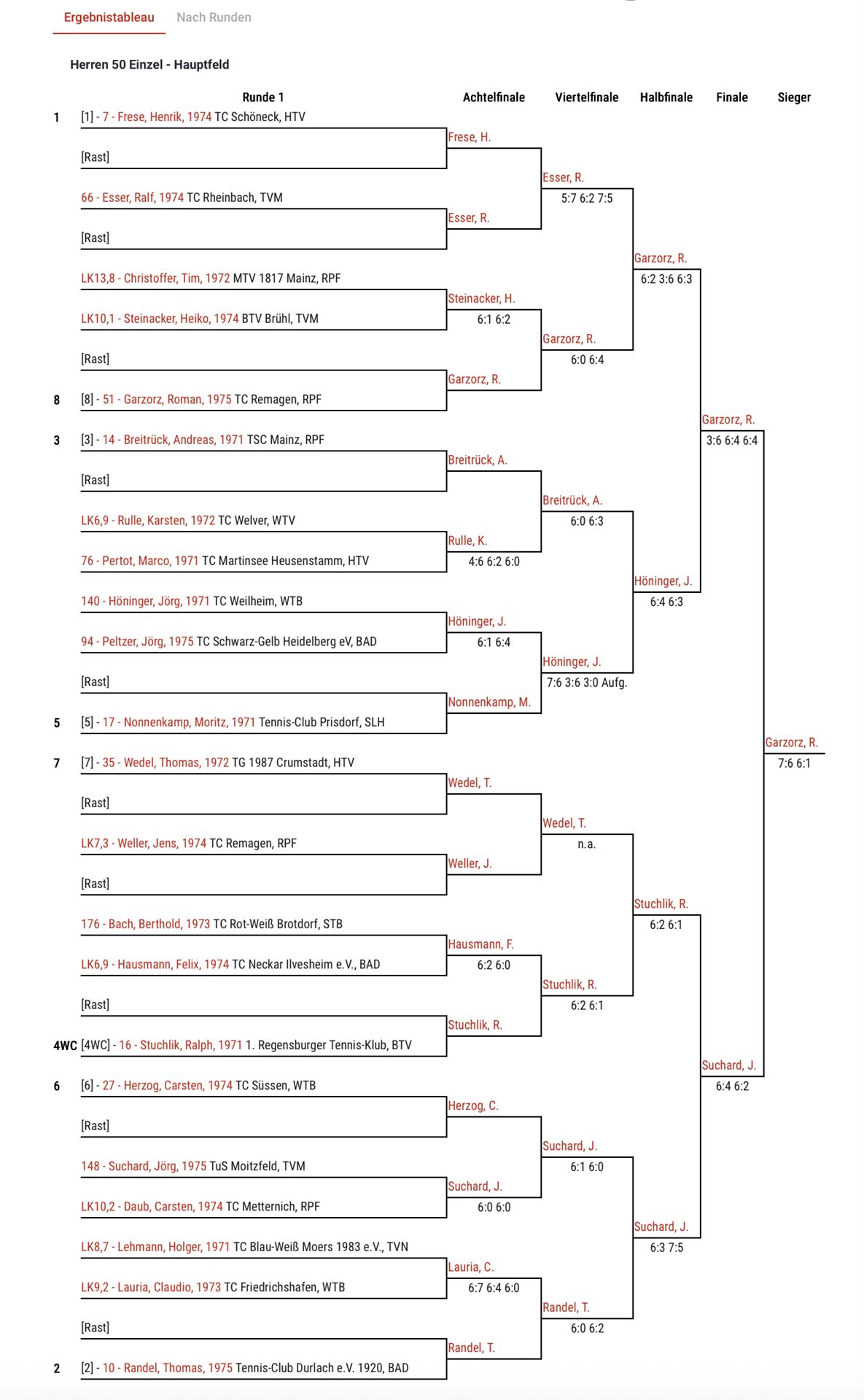 Bei seiner Premiere in der Altersklasse 50 setzt sich Roman Garzorz ohne Satzverlust gegen die starke Konkurrenz durch. Nach seinem Erfolg bei den Rheinlandmeisterschaften feiert er seinen zweiten Meistertitel in Folge und weiß sich nun auf Augenhöhe mit der Spitze.
